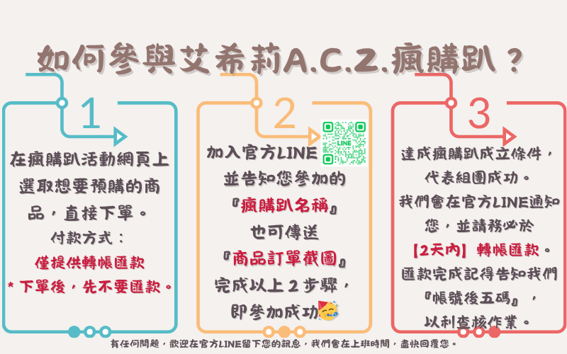 如有任何問題,皆可於官方Line(@acz2412)留下您的疑問,我們會在上班時間盡快回覆您。