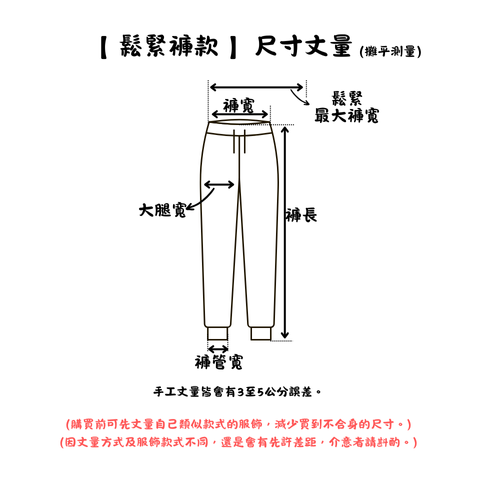 | 褲寬 | 鬆緊最大寬 | 大腿寬 | 褲長 |