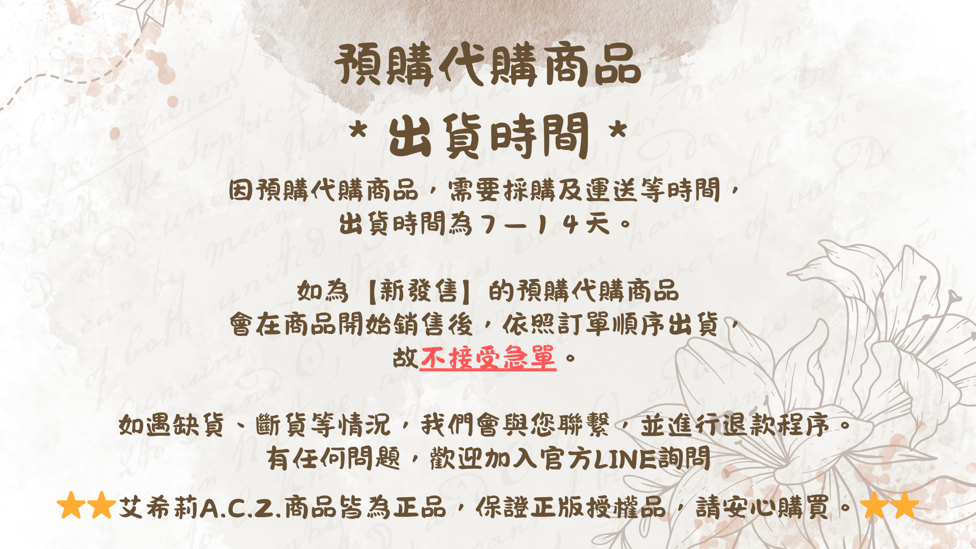 出貨時間:商品發售到貨後,會依照訂單順序出貨,不接急單,請見諒。